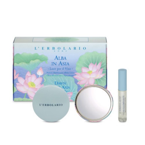 Il kit ALBA ASIA KIT MAKE UP di L'ERBOLARIO è composto da una polvere illuminante con riflessi argentati e un gloss a effetto illuminante. La fragranza è fiorita e muschiata.