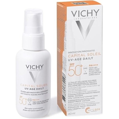 La tecnologia NETLOCK brevettata di questo fluido solare assicura un film protettivo ultra-resistente, garantendo una texture omogenea e una protezione efficace contro i danni del sole. La sua formula è resistente al sudore e testata sotto controllo oftalmologico, rendendolo adatto anche alle pelli più sensibili. L'esposizione prolungata al sole può causare danni irreparabili alla pelle, accelerando il processo di invecchiamento e aumentando il rischio di problemi cutanei. Vichy Capital Soleil UV-Age Daily SPF 50+ offre una difesa completa, aiutando a mantenere la pelle giovane, sana e protetta dagli effetti nocivi dei raggi UV e degli agenti ambientali.