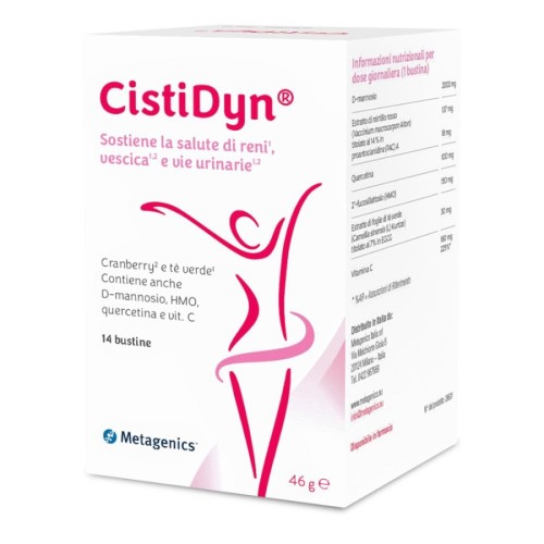 CistiDyn di Metagenics è un integratore alimentare specificamente formulato per supportare la salute delle vie urinarie. Appartenente alla categoria Alimentazione e Integratori, questo prodotto si distingue per la sua composizione a base di D-mannosio, estratto di mirtillo rosso, HMO (oligosaccaride del latte materno), vitamina C e quercetina. La sua formula è pensata per offrire un supporto completo e naturale, contribuendo al benessere di reni, vescica e vie urinarie. Ideale per chi cerca un approccio naturale per il mantenimento della funzionalità urinaria, CistiDyn rappresenta una scelta consapevole per il benessere quotidiano.