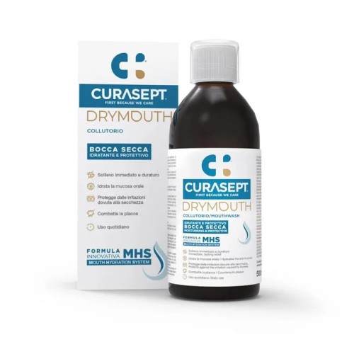 CURASEPT DRYMOUTH COLLUT 500ML è destinato all'igiene orale e particolarmente indicato per individui che soffrono di secchezza orale. È un prodotto per uso quotidiano, consigliato per l'utilizzo in abbinamento ad altri prodotti della linea DryMouth come dentifricio, gel e spray.Caratteristiche