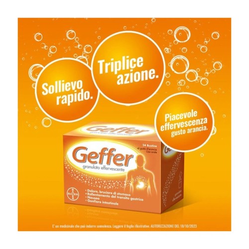 Che cos’è e a che cosa serve Geffer appartiene alla categoria terapeutica dei procinetici (medicinali che accelerano lo svuotamento gastrico): è un medicinale di associazione volto al trattamento dei disturbi derivanti da iperacidità gastrica (eccesso di acido nello stomaco), eccessi alimentari, anormale presenza di aria e gas nello stomaco e difficoltà digestive. Geffer si usa per il trattamento dei sintomi dell'iperacidità (dolore e bruciore di stomaco), quando accompagnata da rallentamento del transito gastrico (digestione lenta), nausea, aerofagia e meteorismo (situazioni caratterizzate da anomalo accumulo di gas nello stomaco o nell'intestino che determina eruttazione, tensione e gonfiore addominale). Si rivolga al medico se non si sente meglio o se si sente peggio dopo 3 giorni.