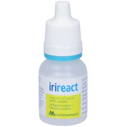 Che cos’è e a che cosa serve IRIREACT contiene i principi attivi feniramina maleato e tetrizolina cloridrato. Feniramina maleato appartiene ad un gruppo di medicinali chiamati “antistaminici” e agisce contrastando i sintomi dell'allergia. Tetrizolina cloridrato appartiene ad un gruppo di medicinali chiamati “decongestionanti” e agisce riducendo la dilatazione dei vasi del sangue. IRIREACT si usa per trattare le allergie e le infiammazioni della membrana dell'occhio (congiuntiva) accompagnate da ipersensibilità alla luce (fotofobia), lacrimazione, sensazione di corpo estraneo, dolore. Si rivolga al medico se non si sente meglio o se si sente peggio dopo 4 giorni di trattamento.