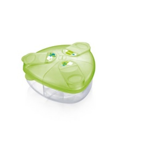 Contenitore per latte in polvere facile da riempire, grazie ai tre scomparti che contengono ciascuno più di 40 g di polvere; facile da aprire e chiudere, grazie alle ampie aperture laterali che permettono di versare la polvere completamente; a prova di perdita, grazie alla chiusura ermetica.- Forma triangolare per facilitare il riempimento del biberon