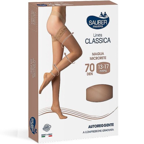 Sauber Calza Autoreggente 70 Denari, microrete, offre comfort e azione tonificante. Balze in pizzo con silicone, ideale per gambe stanche. Previene le varici, riduce gonfiori. Disponibile in nero. Compressione graduata. Taglia 4, Linea Classica. Dispositivo medico.