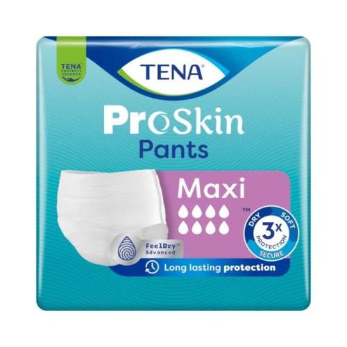 TENA ProSkin Pants Maxi si indossa come normale biancheria intima. La sua forma anatomica è progettata per adattarsi al corpo di uomini e donne, offrendo una protezione elevata contro le perdite abbondanti di urina. È indicata per un utilizzo sia diurno che notturno.