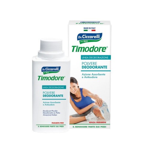 Timodore Polvere Deodorante Piedi è indicato per combattere l'eccessiva sudorazione e il cattivo odore dei piedi. È particolarmente utile in caso di macerazione e traspirazione eccessiva. Adatto per sportivi, ragazzi, uomini e donne di tutte le età.Azione