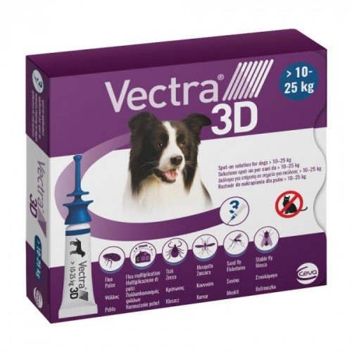Vectra 3D è un medicinale veterinario antiparassitario spot-on per cani di peso compreso tra 10 e 25 kg. Contiene tre principi attivi: dinotefuran, piriproxifene e permetrina. È efficace contro pulci, zecche, flebotomi, zanzare e mosche. Protegge fino a un mese e previene la moltiplicazione delle pulci inibendo l'apertura delle uova e la comparsa degli adulti per due mesi. Può essere utilizzato anche nell'ambito di una strategia per il trattamento della dermatite allergica da pulci.Modalità d'uso e Posologia